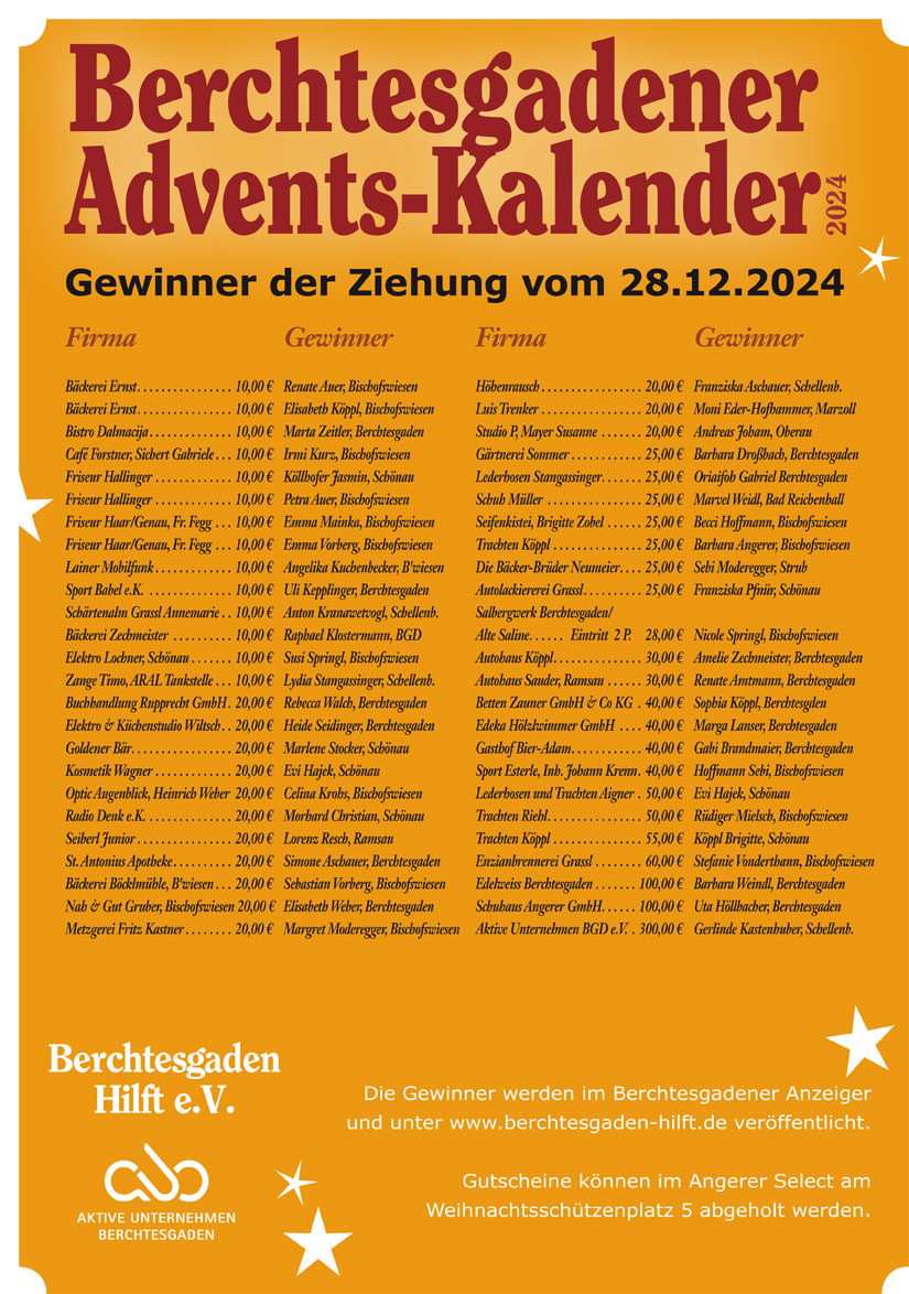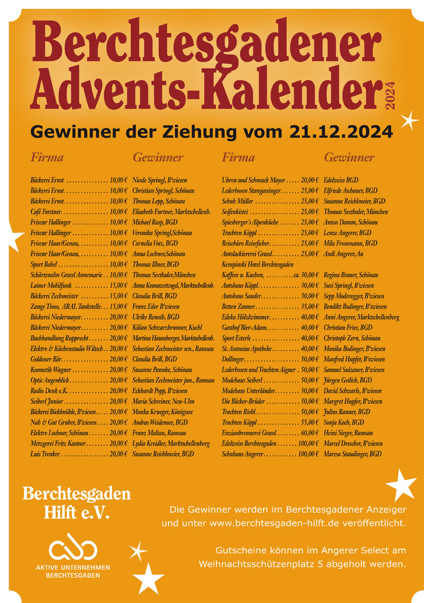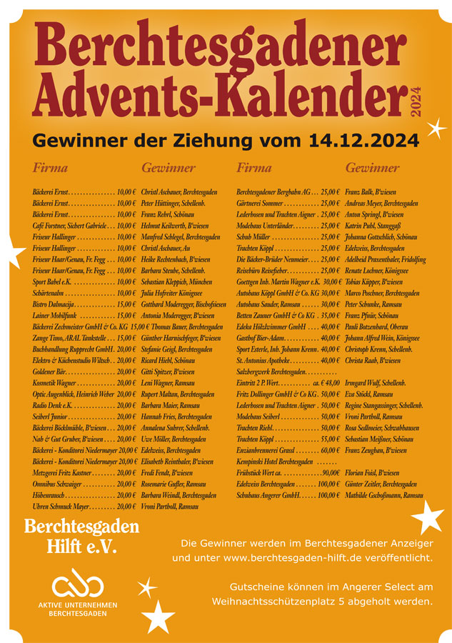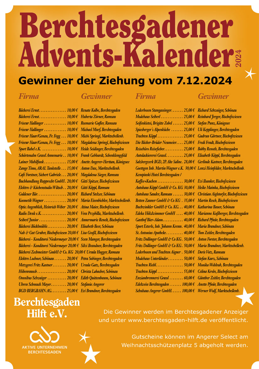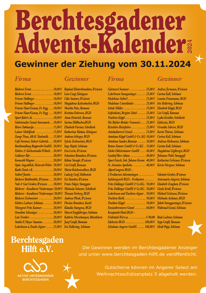 … findet der Berchtesgadener Adventskalender statt. Initiiert vom Berchtesgaden hilft e.V. können Sie "Helfen und Gewinnen", denn der Reinerlös wird jedes Jahr an verschiedene gemeinnützige Organisationen, Einrichtungen etc. gespendet.